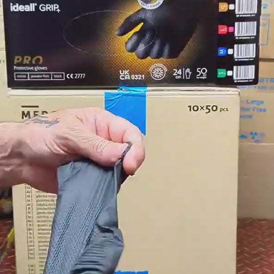 Mercator Ideall Grip Pro Black Powder-Free Nitrile Gloves are designed to last up to 5x longer than standard disposable nitrile gloves. Measuring 240mm long, these type B black nitrile gloves feature a diamond-texture grip on both the inner and outer surfaces, offering superior traction and control.