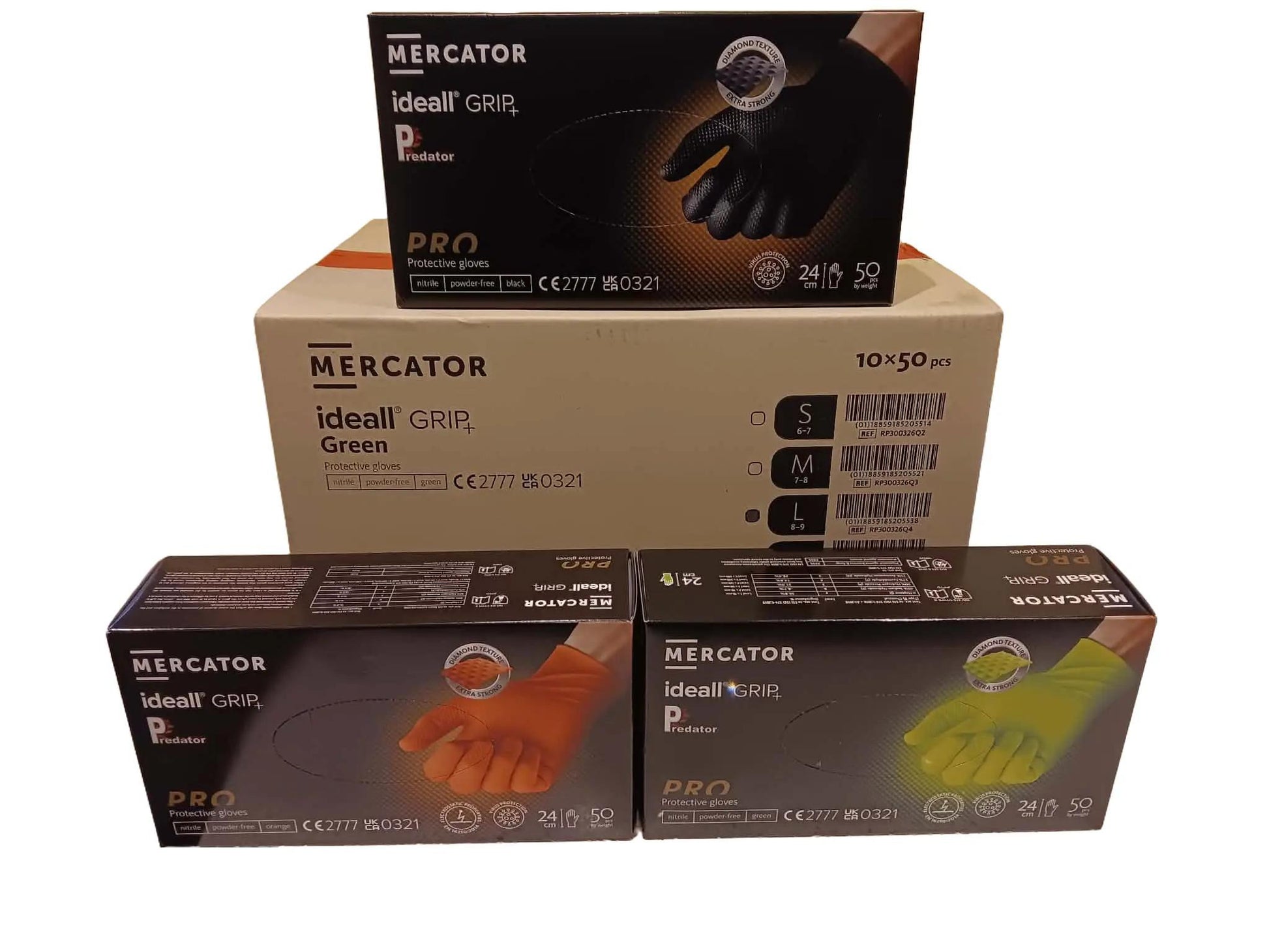 Mercator Ideall GRIP+ 3 BOXES - Premium Diamond Grip Nitrile Gloves | Sizes M, L, XL | Black • Orange • Green