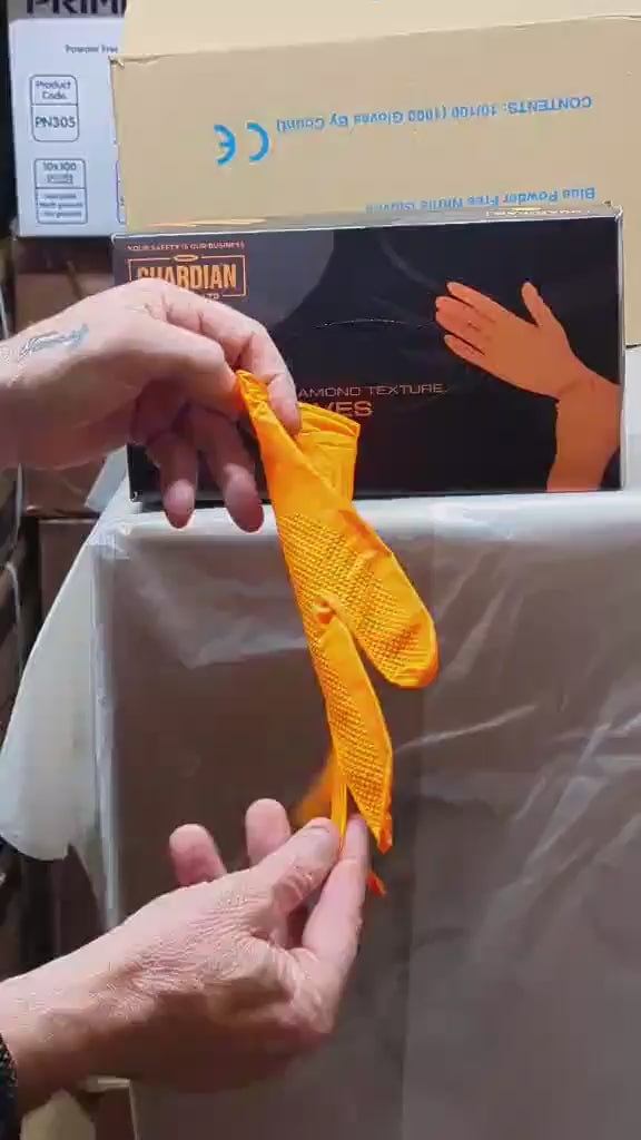Built for performance, protection, and visibility, Guardian Orange Nitrile Diamond Grip Gloves are the go-to choice for professionals needing a strong, reliable glove that can handle tough jobs and wet conditions with ease.